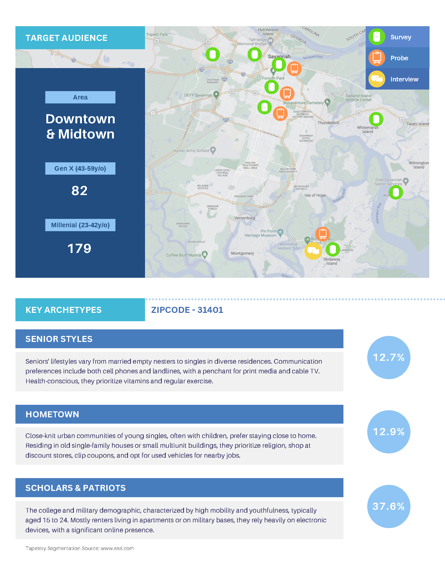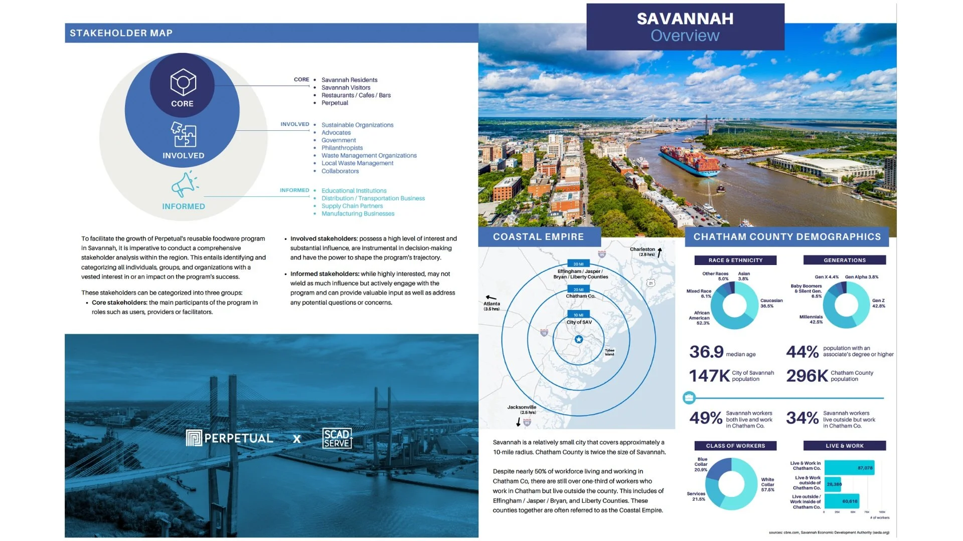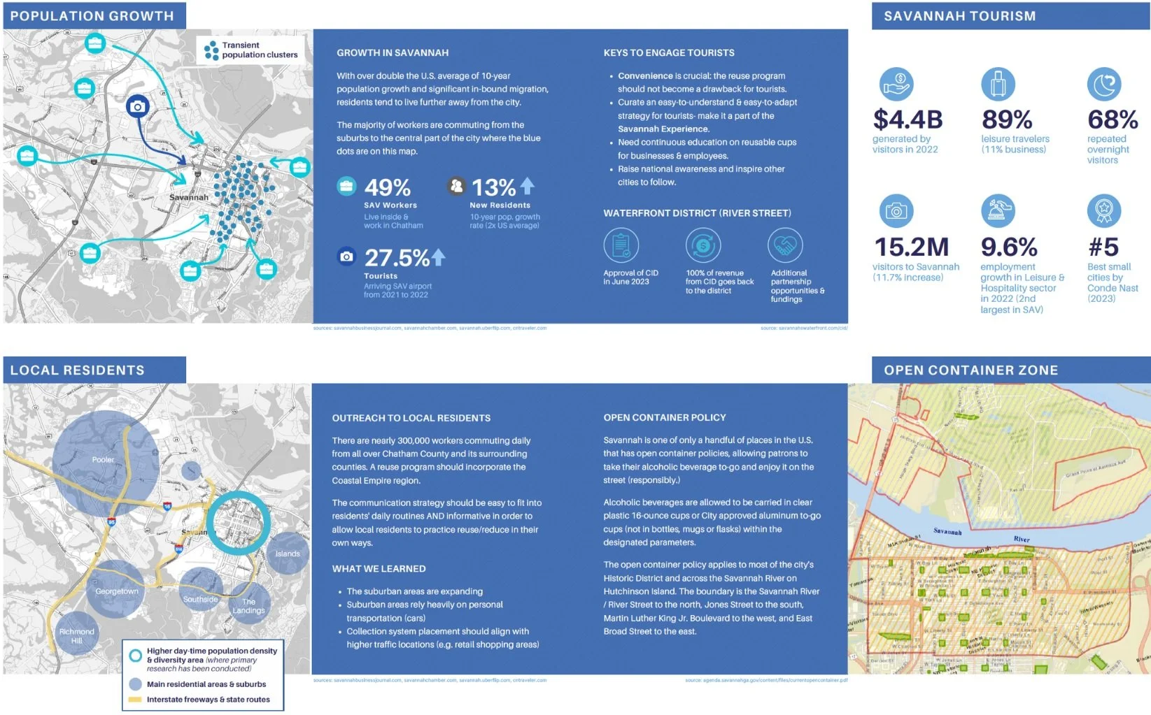 The team conducted comprehensive secondary research on Savannah, focusing on several key areas. We examined demographic data for Chatham County and the broader Coastal Empire region, including population statistics, racial and ethnic breakdown, generational makeup, and workforce characteristics. The research also covered Savannah's economic landscape, particularly its tourism sector, providing insights into visitor numbers, economic impact, and employment growth. Additionally, the team analyzed population growth trends, commuting patterns, and residential areas. We looked into Savannah's unique features like the open container policy and the Waterfront District. This thorough approach allowed us to gain a holistic understanding of Savannah's socio-economic context and its potential implications for implementing a reusable foodware program.