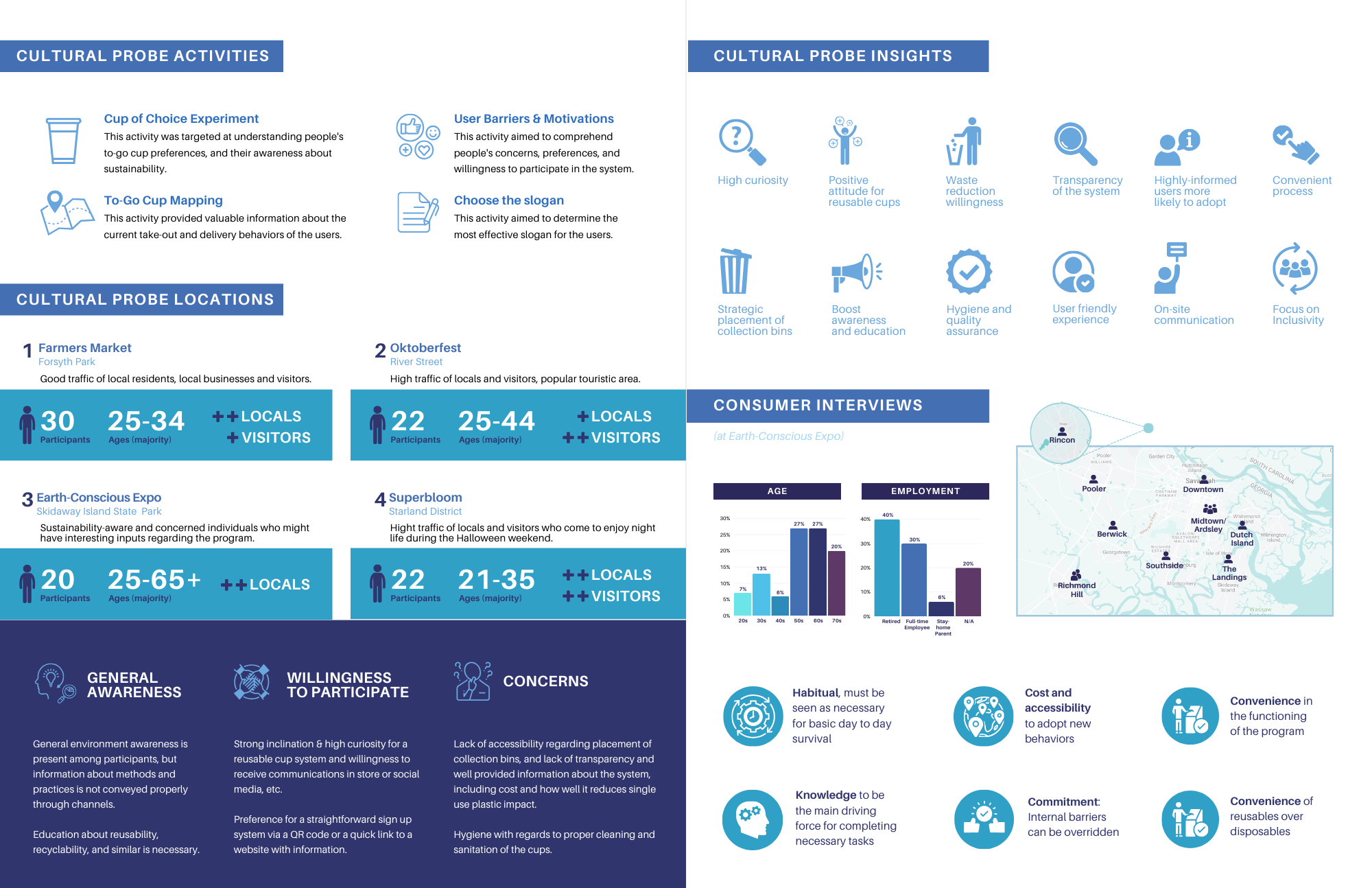 The team conducted extensive primary research in Savannah using multiple methods. We carried out surveys distributed via social media, email/text, and QR codes posted around the city, gathering 100 responses. The team also conducted interviews and held meetings with various stakeholders. Cultural probe activities were implemented, including a Cup of Choice Experiment, To-Go Cup Mapping, and a slogan selection activity. These probes were conducted at four key locations: Farmers Market, Oktoberfest, Earth-Conscious Expo, and Superbloom, engaging different age groups of locals and visitors. Additionally, we performed consumer interviews across various neighborhoods in Savannah. This multi-faceted approach allowed us to gather insights on current take-out patterns, sustainability awareness, willingness to participate in reusable programs, and potential barriers to adoption.