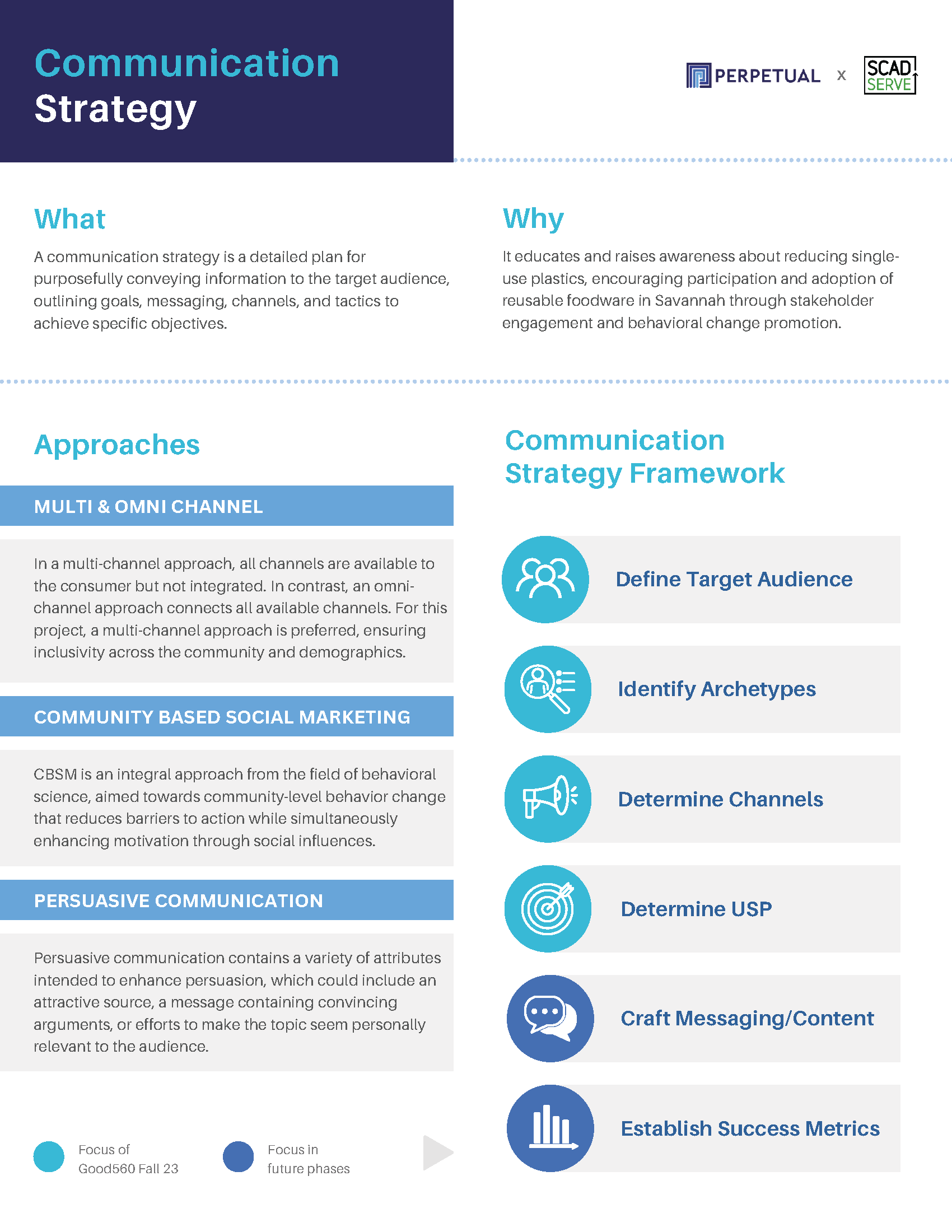 We conducted a comprehensive workshop with the Perpetual team, stakeholders from the City of Savannah, and local businesses who will be implementing our reusable system. During this workshop, we presented a detailed run-through of our secondary and primary research findings. We shared our insights from Perpetual's Value Study, our observations, and cultural probes that helped us understand Savannah's unique context. We also discussed the communication patterns we had analyzed and presented our proposed communication strategies tailored for the Savannah community.