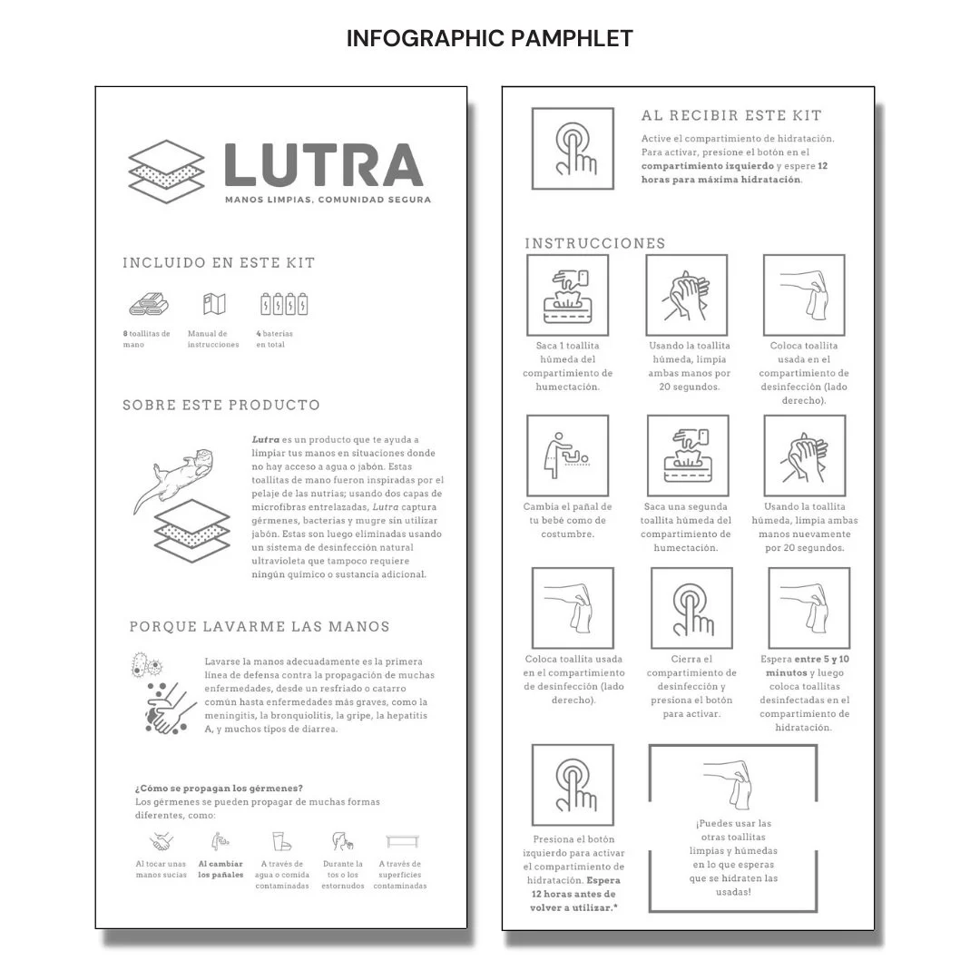 The Lutra kit has two sections once unzipped. To the left, a chamber keeps the towelettes moist by capturing humidity in the atmosphere. Tucked into a front pocket of the humidity chamber rests an infographic to facilitate hygienic behavior changes in users. To the right, there is a chamber dedicated to the UV sanitation of the towelettes. The UV chamber features an indicator lock that prevents users from opening the container too early and visually notifies them when the towel is clean.