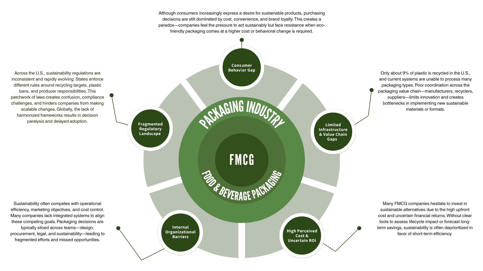 The Problem -The FMCG (Fast-Moving Consumer Goods) sector—particularly in the food and beverage industry—is one of the largest contributors to plastic pollution globally. Packaging waste accounts for nearly 50% of all plastic waste, with much of it designed for single-use. While the environmental urgency is clear, the path to sustainable packaging remains obstructed by multiple, overlapping barriers :