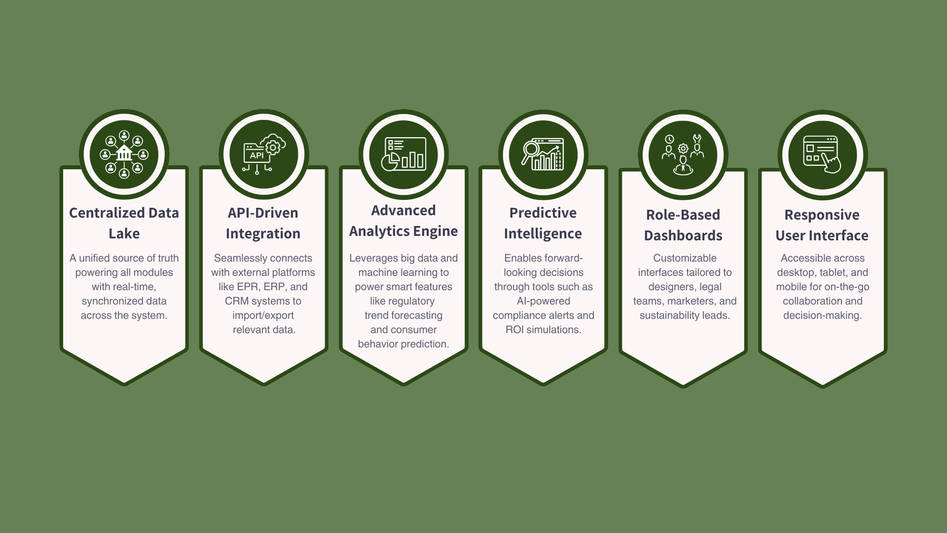 At the core of EcoWrapped lies a robust digital architecture designed for adaptability, integration, and intelligence. Each component plays a critical role in streamlining sustainability decision-making—from a centralized data lake that unifies all modules in real time, to predictive AI tools that anticipate regulatory and consumer trends. Seamless integration with external systems, customizable dashboards for different user roles, and responsive design ensure that the platform not only fits into existing operations but actively enhances them. Together, these six pillars provide the technological backbone for scalable, data-driven sustainability transformation.